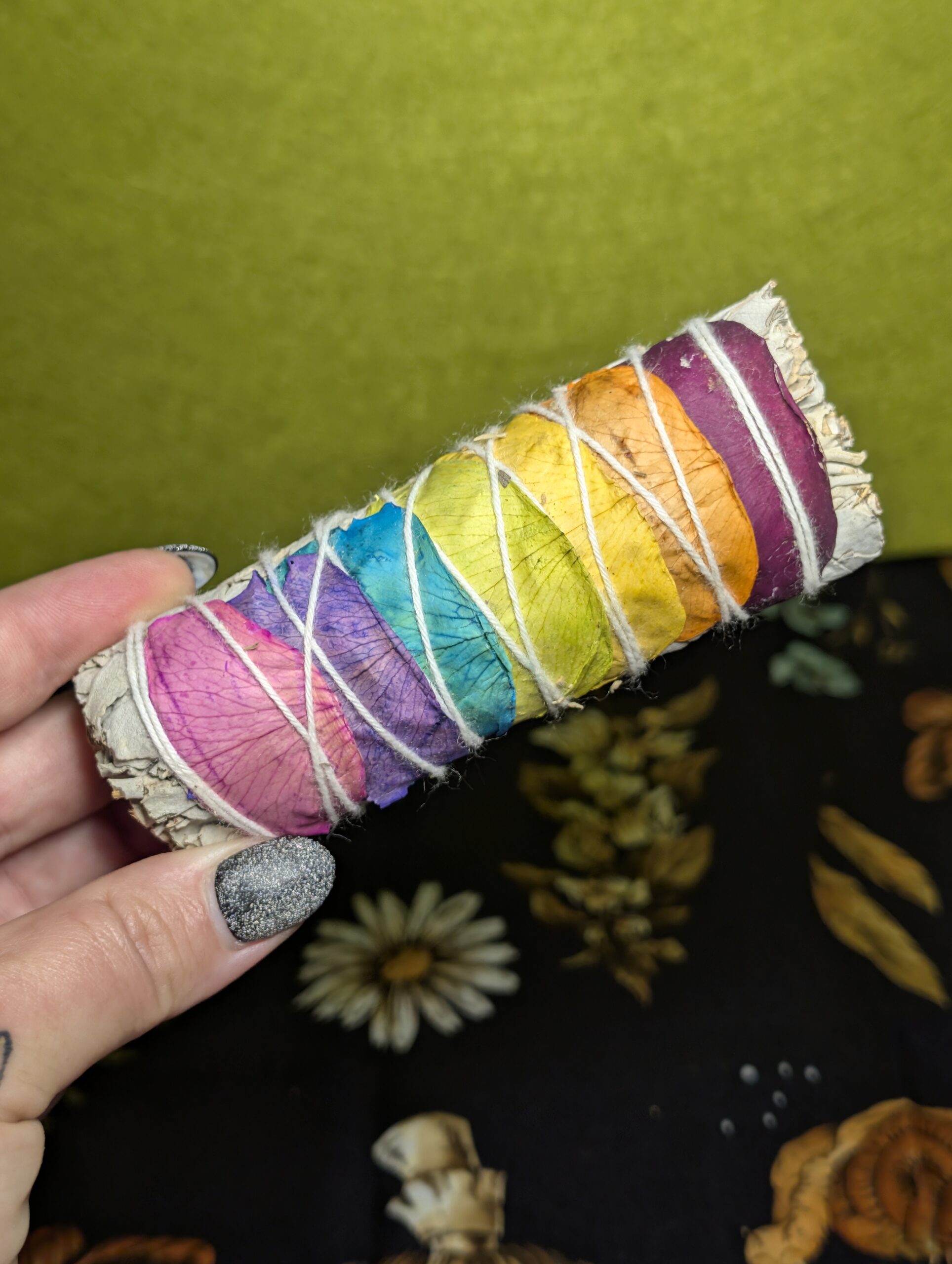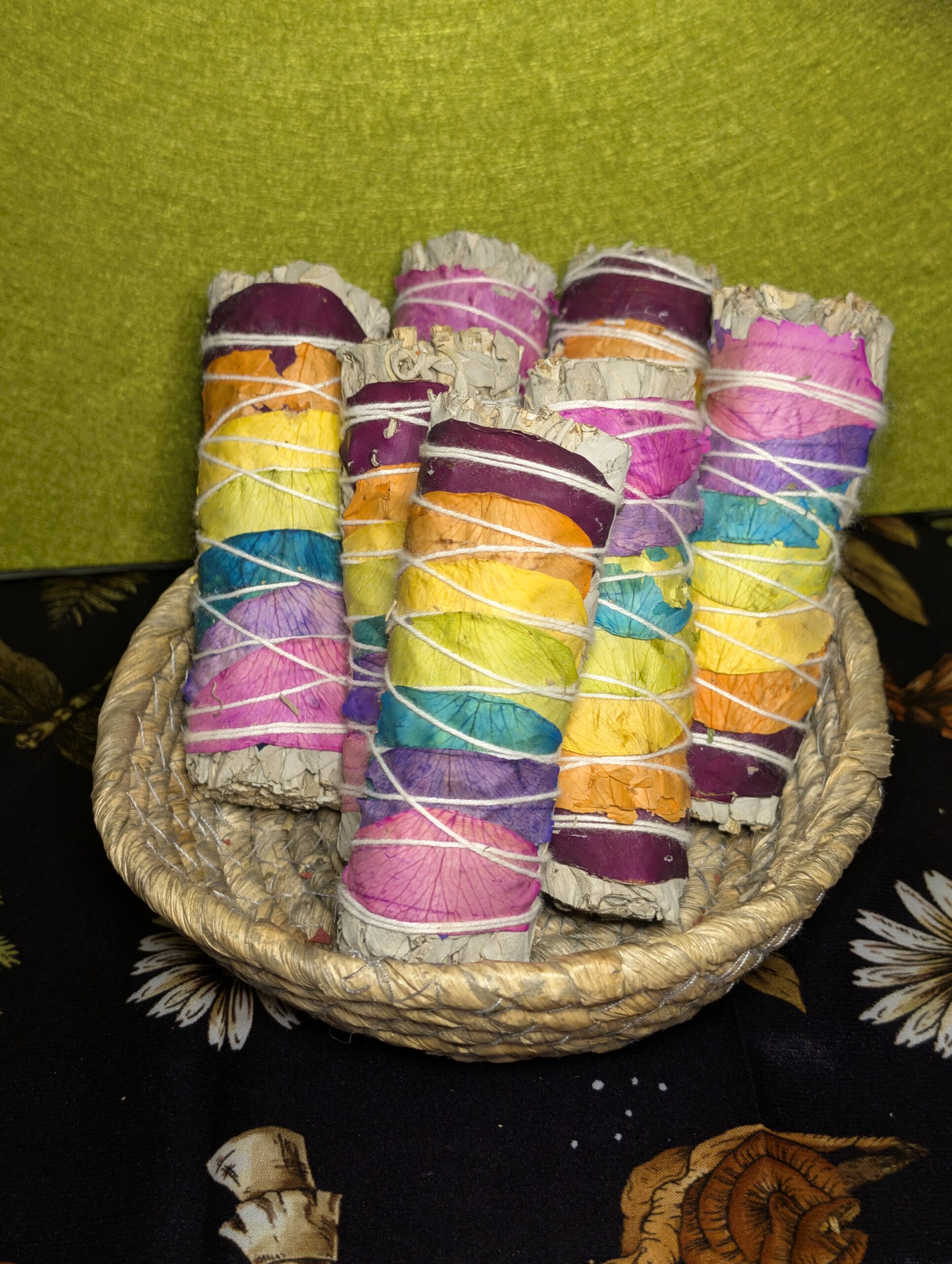 White Sage wrapped with chakra-colored rose petals for cleansing, balance, and energetic alignment.