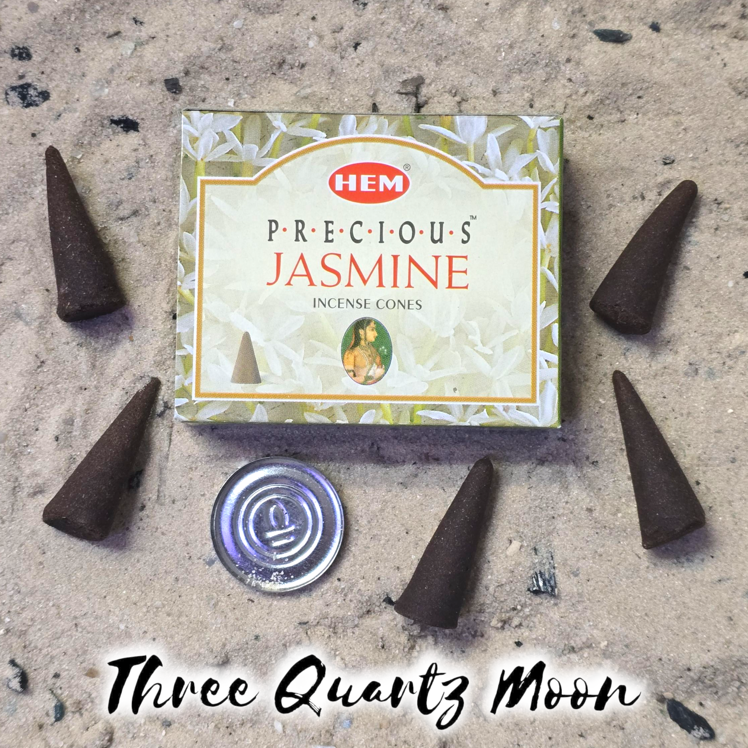 Box of 10 Precious Jasmine incense cones with burner disc. A soothing floral scent for love, calm, and inner peace.